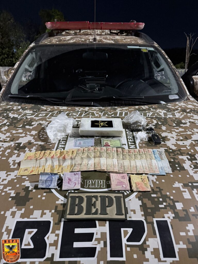 Na abordagem, os militares encontraram um tijolo de cocaína, além de duas porções menores da mesma droga, uma porção de skank (variedade mais concentrada de maconha), R$ 1.177 em dinheiro trocado, dois celulares, um anel dourado, uma carteira com documentos, além de chaves de residência e de veículo.